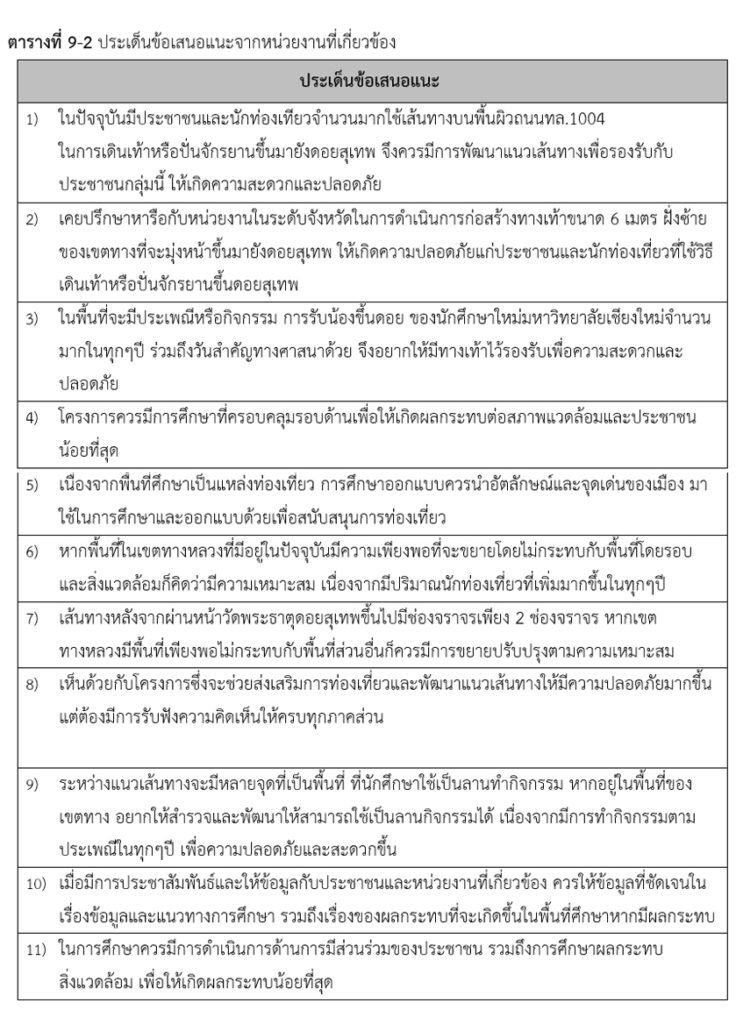 ที่ปรึกษาได้ดำเนินการเข้าพบหน่วยงานที่เกี่ยวข้อง ในช่วงวันที่ 12-13 มีนาคม 2568 เพื่อชี้แจงให้ทราบถึงรายละเอียดข้อมูลโครงการเบื้องต้นรวมทั้งแผนการศึกษาของโครงการ พร้อมนำประเด็นข้อห่วงกังวล ข้อคิดเห็น และข้อเสนอแนะดังกล่าวมาประกอบการศึกษา ด้านวิศวกรรมและสิ่งแวดล้อมตลอดจนแผนการดำเนินงานการมีส่วนร่วมของประชาชน และการประชาสัมพันธ์โครงการให้สอดคล้องกับความต้องการของท้องถิ่น ซึ่งมีรายละเอียดดังตารางที่ 9-1 และ ประเด็นความคิดเห็นและข้อเสนอแนะต่อการศึกษาของโครงการ ดังตารางที่ 9-2