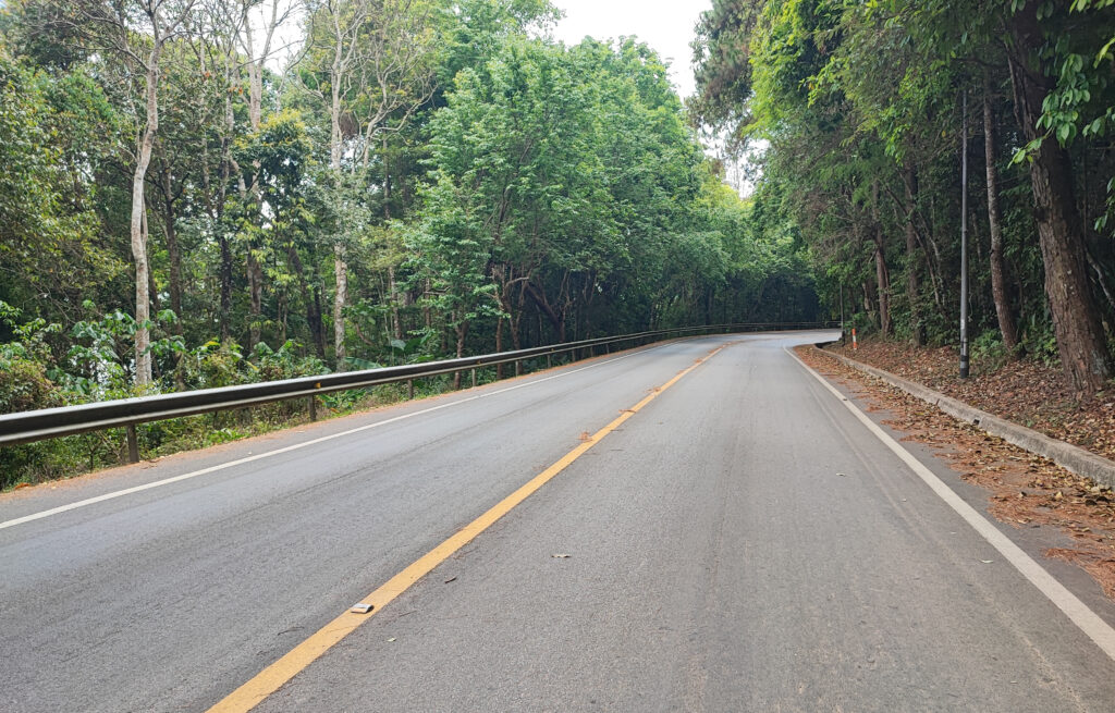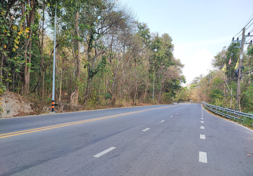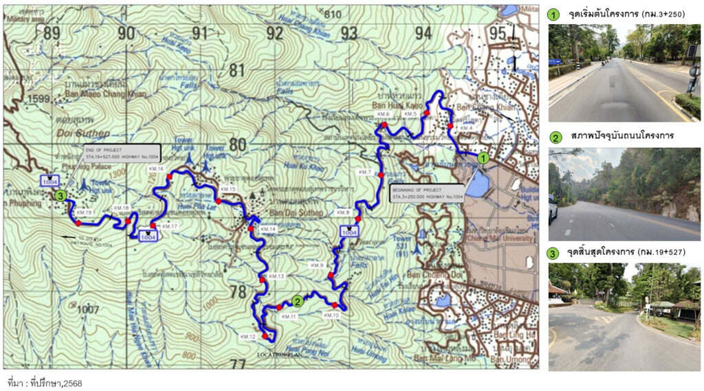 สภาพปัจจุบันของพื้นที่โครงการ 6.1 สภาพปัจจุบันของพื้นที่โครงการ จากแนวคิดเบื้องต้นในการออกแบบแนวเส้นทางโครงการ ดำเนินการบนทางหลวงหมายเลข 1004 ขนาด 2-3 ช่องจราจร ในตำบลช้างเผือก ตำบลสุเทพ อำเภอเมืองเชียงใหม่ จังหวัดเชียงใหม่ โดยมีจุดเริ่มต้นโครงการอยู่ที่หลักกิโลเมตรที่ 3+250 และมีจุดสิ้นสุดอยู่ที่หลักกิโลเมตรที่ 19+527 รวมระยะทางประมาณ 16.277 กิโลเมตร โดยสภาพพื้นที่บริเวณ 2 ข้างทางของแนวเส้นทางเป็นพื้นที่เขาสูงชัน แสดงดังรูปที่ 6.1-1 ถึง 6.1-3 รูปที่ 6.1-1 สภาพพี้นที่ข้างทางทางหลวงหมายเลข 1004 (ขนาด 3 ช่องจราจร) รูปที่ 6.1-2 สภาพพี้นที่ข้างทางทางหลวงหมายเลข 1004 (ขนาด 2 ช่องจราจร) รูปที่ 6.1-3 สภาพปัจจุบันพี้นโครงการ ทางหลวงหมายเลข 1004